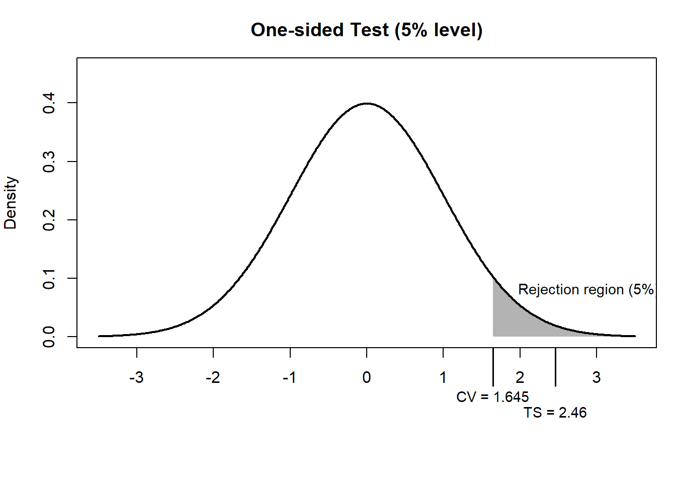 The critical value is 1.645, meaning we reject the null if the test statistic exceeds this threshold.