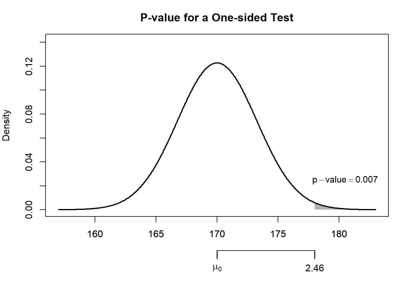 So the observed sample mean is about 2.46 standard errors above the null value, giving a p-value of about 0.007.