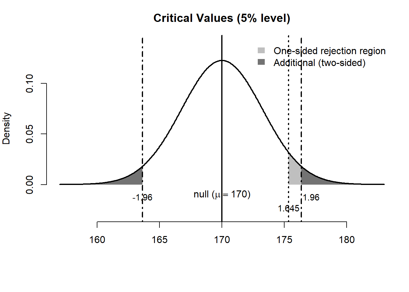 - One-sided → place all \(\alpha\) in one tail → critical value = 1.645