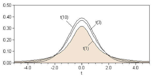 The degrees of freedom for our purposes, which we will denote \(df\), is for our purposes the sample size less one, \((n-1)\). Note that the larger the sample size, the more and more the t-distribution looks like the normal curve.