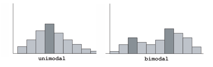 Histograms can also be unimodal, with a single peak, or bimodal, with two peaks, and so on.