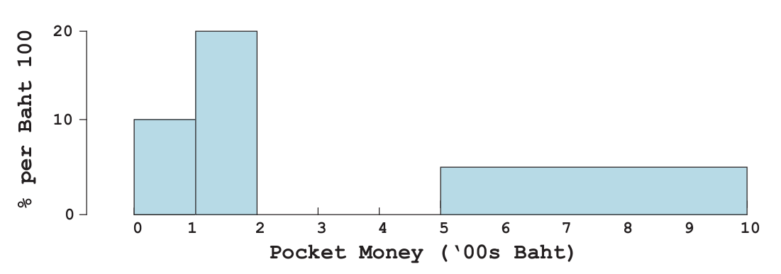 For example, the interval 150–210 spans two 30,000-baht units. Dividing 24% by 2 gives the correct height. The vertical axis is therefore a density scale (percent per 30,000). The correct histogram is: