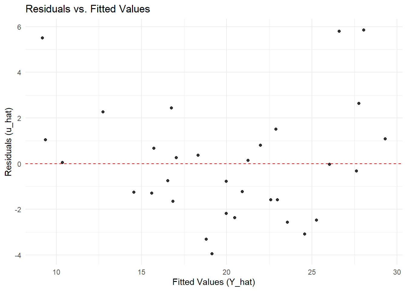 ggplot(diagnostic_data, aes(x = fitted, y = residuals)) +geom_point(alpha =0.8) +geom_hline(yintercept =0, linetype ="dashed", color ="red") +labs(title ="Residuals vs. Fitted Values",x ="Fitted Values (Y_hat)",y ="Residuals (u_hat)") +theme_minimal()